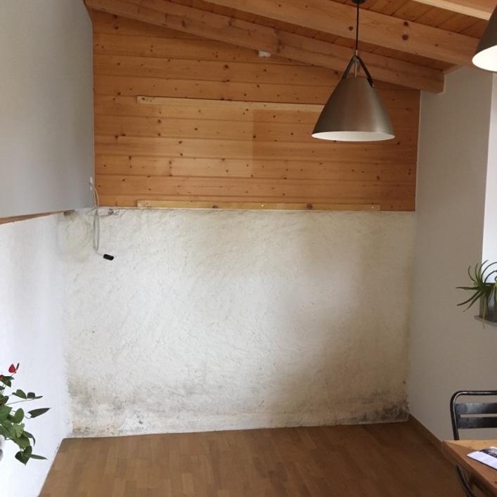 Une paroi phonique a été créée entre le salon et la chambre parentale. La paroi a été confectionnée avec différents matériaux, tout en gardant un aspect visuel en harmonie avec l’ensemble de la pièce. L’escalier a été gardé dans l’état et une porte phonique a été créée donnant accès à la chambre parentale.